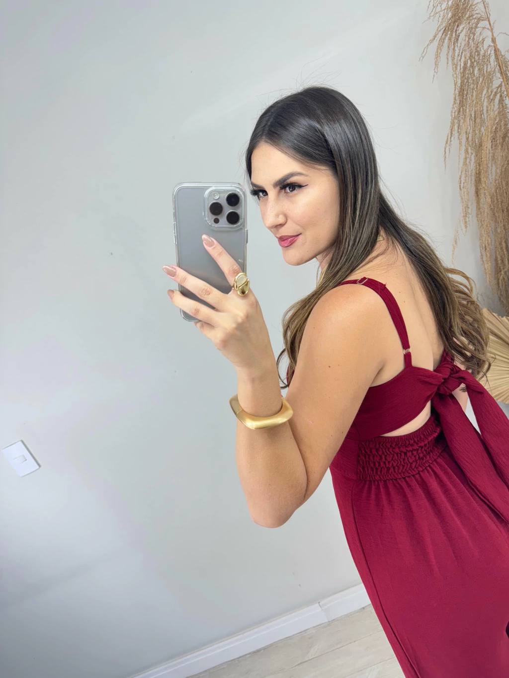 - Detalhe de amarração nas costas: Um toque delicado e moderno que permite ajustar o caimento para o seu corpo.